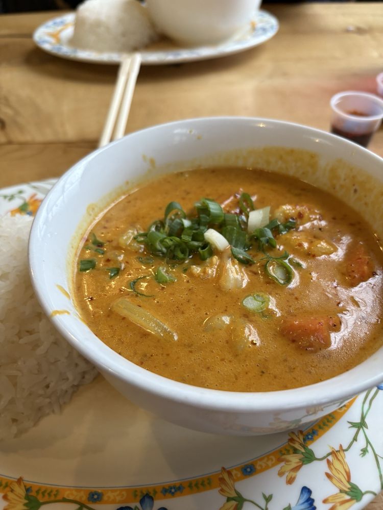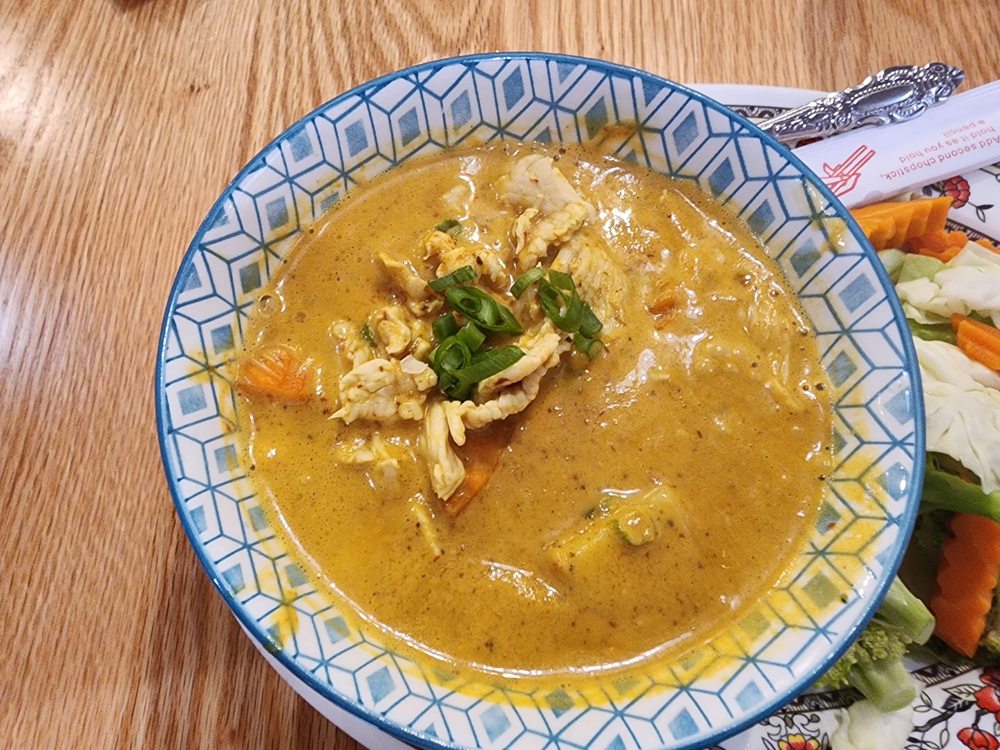 Mild, yellow curry in coconut milk with green onions, carrots and potatoes. Comes with your choice of protein. Gluten free.